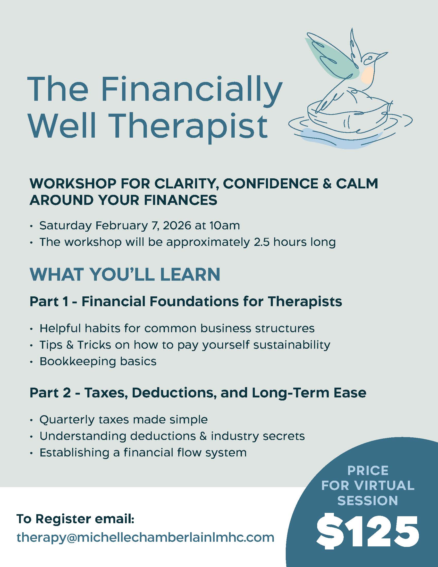 My goal is not to turn therapists into accountants or entrepreneurs – but to help you feel informed, resourced, and steady enough to build a career that truly supports your life.
